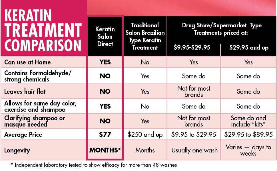 - DELIVERS SALON QUALITY RESULTS AT HOME, SAFELY and EFFECTIVELY: Keratin Salon Direct provides comparable results to traditional salon Brazilian-type keratin smoothing treatments when it comes to removing frizz and smoothing hair – but without the harmful chemicals. And, because KSD works from the inside out to strengthen and fortify hair, results with KSD mean hair is not only smoother, but also healthier looking and more manageable.