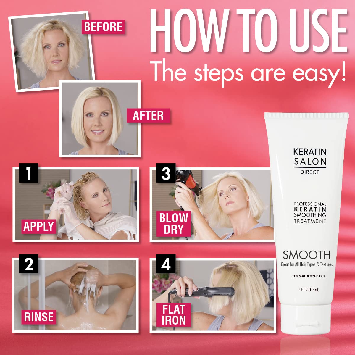 - CONVENIENT AND SAFE FOR YOU TO USE AT HOME: (1) Apply it to your clean damp hair (2) Leave it on your hair for the recommended amount of time (3) Blow dry your hair and then flat iron until silky. That’s it! Style any way you want! Your hair will look like you just left the salon, and the gorgeous look and feel will last for months. Your hair can be curled or dried with a round brush for volume - the fabulous look only professional treatment can deliver!