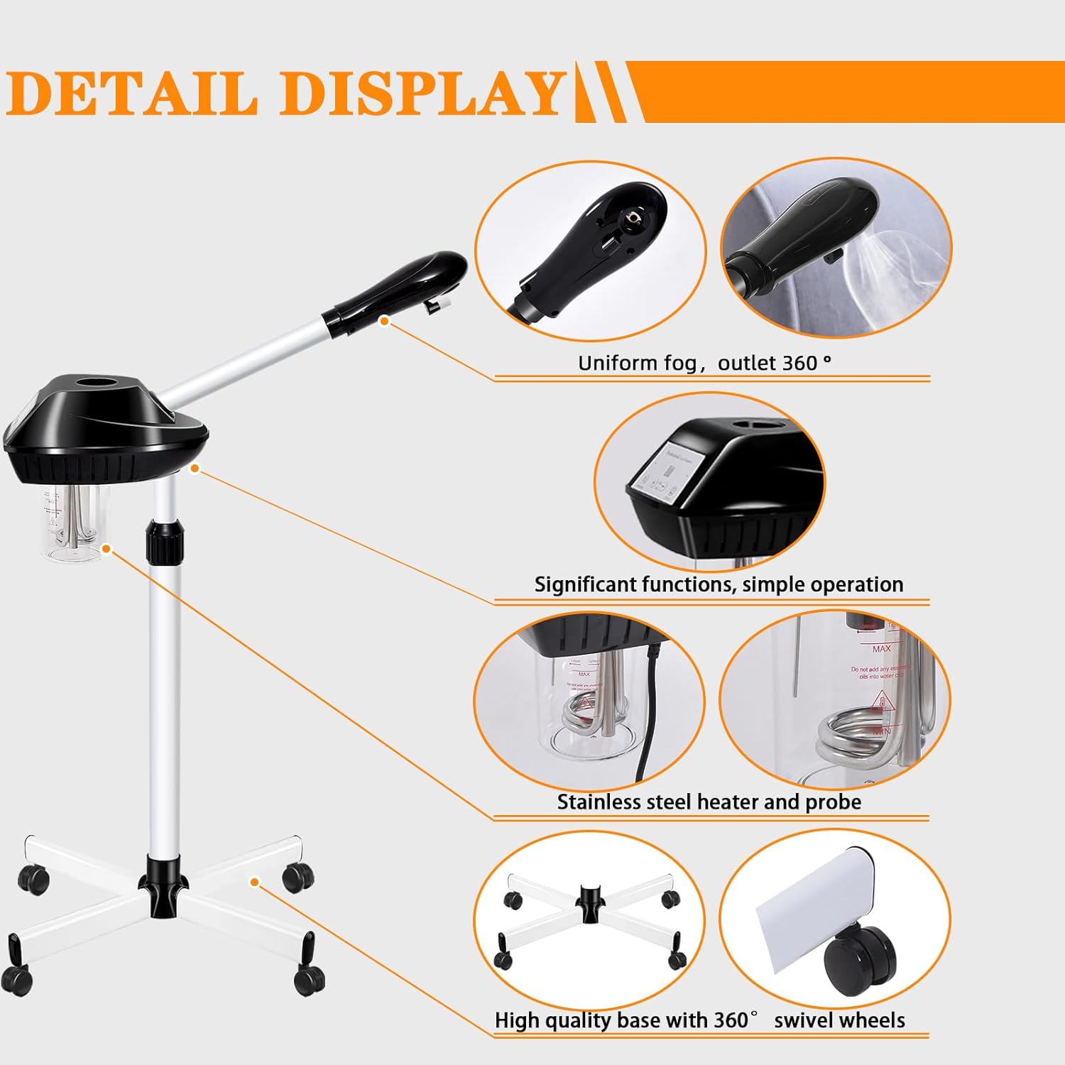 • 【Facial Steamer Professional】Our facial steamer comes with an upgraded atomizing cartridge, removable 500 ML water cup, 36-52 inch adjustable height, 360° rotating nozzle, and 360° rotating body.