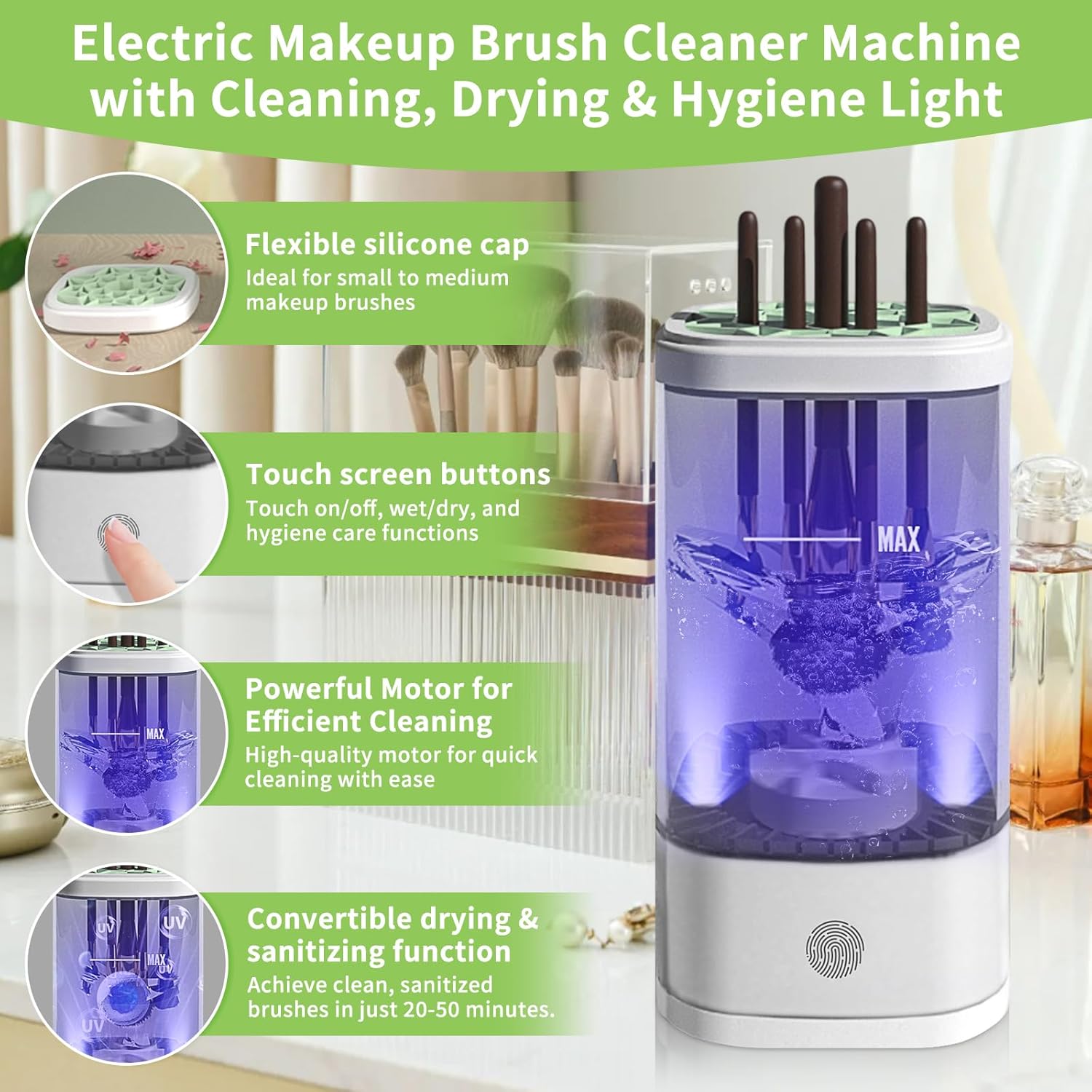 • 【 Deep Cleaning Power 】This Electric Makeup Brush Cleaner is powered by a high-speed 9000 RPM motor that delivers deep, thorough cleansing within seconds. Designed to effortlessly remove foundation, powders, oils, and built-up product, the motor spins at high velocity to agitate bristles and dislodge every bit of residue, giving your brushes a fresh, brand-new feel. It's a fast, hygienic, and mess-free solution for every beauty routine.